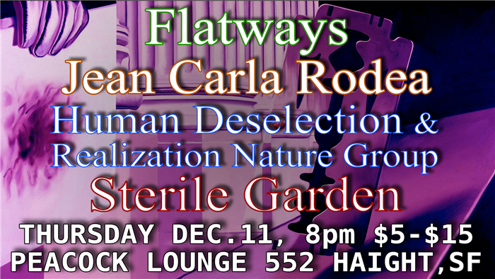 The banal and sublime collide with entropic abandon, ploughed deep by the mindful hands of Jacob DeRaadt, stalwart craftsman of industrial aesthetics and musique concrète. Constructing antimusical and musical sounds around film by manner of crude tape manipulation, intense cut-up, and harsh noise. Coming all the way from Arcata for this rare live performance, it's up to you to cross the final mile now. Bring your deadest hopes to plant inside the Peacock Lounge, then listen close.