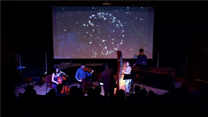 Blending harp, electroacoustics, creative coding, and real-time visuals, the performance creates a shared audiovisual setting with moments of audience participation.