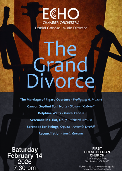 Echo Chamber Orchestra takes a gentle poke at Valentine's Day with "The Grand Divorce.” Starting with the "Marriage of Figaro" overture, the orchestra will "split up" and perform music featuring the brass, woodwind, percussion and string sections. The ensemble will regroup to play the premiere of Reconciliation (Rorqual) by Marin composer Kevin Gordon. The program includes Daniel Canosa's Delphine Waltz (2022) for marimba, vibraphone and piano.