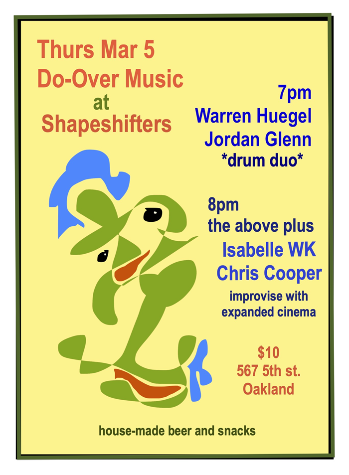The Do-Over Music Series at Shapeshifters Cinema, organized by Lisa Mezzacappa and Jordan Glenn, is a monthly series of sound performances presented by a rotating cast of local luminaries and special guests. The first set features performances of creative - improvised - composed - electronic - acoustic - music. The second set opens up to a live improvised collaboration of sound and visuals made using images culled from the Shapeshifters 16mm film collection.