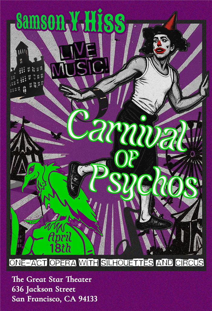 Calamitous carny, Samson Y Hiss, the award-winning composer and record-holding one-man band, brings his psychotic ooze of opera, silhouettes and circus to The Great Star Theater in San Francisco, CA. The theatrical experience features an original story, operatic vocals, circus performers, stunt artists, overhead projector and silhouettes and a live band.