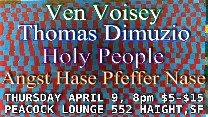 Presence irreducible, being itself, without translation or utility, is our substrate beneath perception. The ability to summon presence without attachment, subjectivity itself without identification, is an approach to art that defies easy description. Ven Voisey summons physical space, in sound, with kinetic automata, through time and motion. This isn't meant to be art speak but an accurate explanation of why you have to be inside the Peacock Lounge for what will happen. Much more fun than artspeak might imply, Voisey is easy to be around and no genre or jargon explains what he does. Close as we can tell, he's an artist marvellously attuned to form, material, technology, and ontology, modulating time and presence into something perceptible that leaves you saying, holy shit. Tonight might have to do with a multichannel distributed sound sculpture in darkness. Take a peek at his past work, I'll shut up.