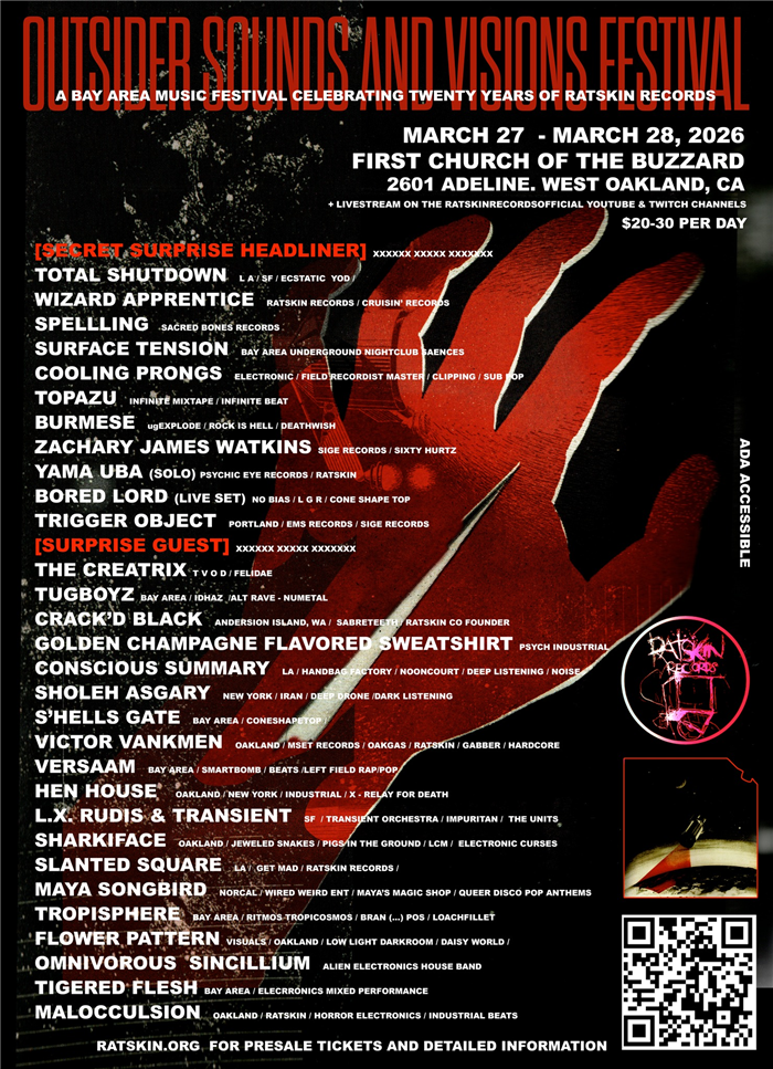 Ratskin Records Outsider Sounds and Visions Festival - 20 Years of Ratskin Records Fri, Mar 27 @ 7:00PM — Sat, Mar 28 @ 11:45PM (PDT, UTC-07) First Church Of The Buzzard, 2601 26th St., Oakland