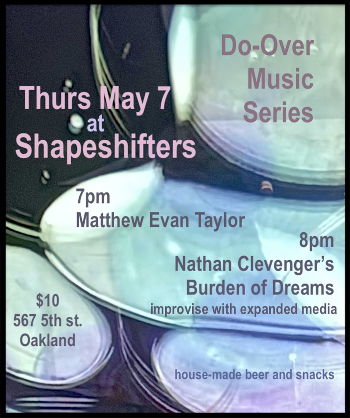 The Do-Over Music Series at Shapeshifters Cinema, organized by Lisa Mezzacappa and Jordan Glenn, is a monthly series of sound performances presented by a rotating cast of local luminaries and special guests. The first set features performances of creative - improvised - composed - electronic - acoustic - music. The second set opens up to a live improvised collaboration of sound and visuals made using images culled from the Shapeshifters 16mm film collection.